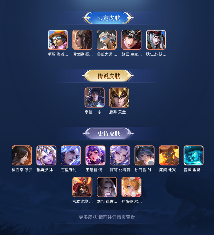 【V7 92皮】传说皮肤7个史诗皮肤14个限定皮肤22全部皮肤60个成为英雄吕布钟无艳孙尚香