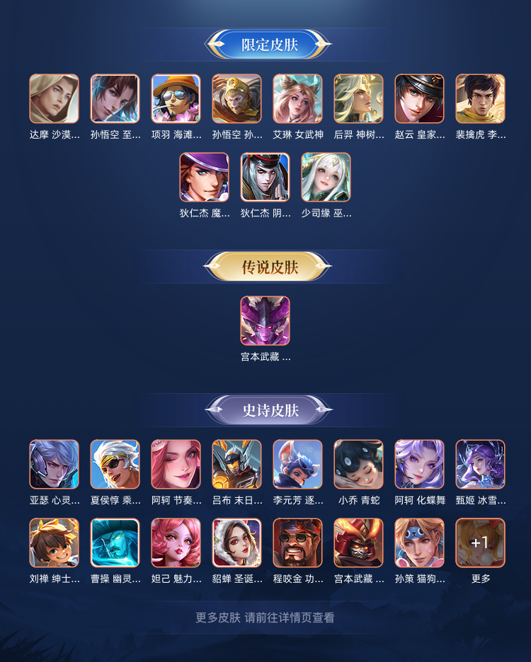 韩信傲雪梅枪、橘右京修罗、李白千年狐、阿轲节奏热浪、花木兰水晶猎龙者(37史诗皮肤)