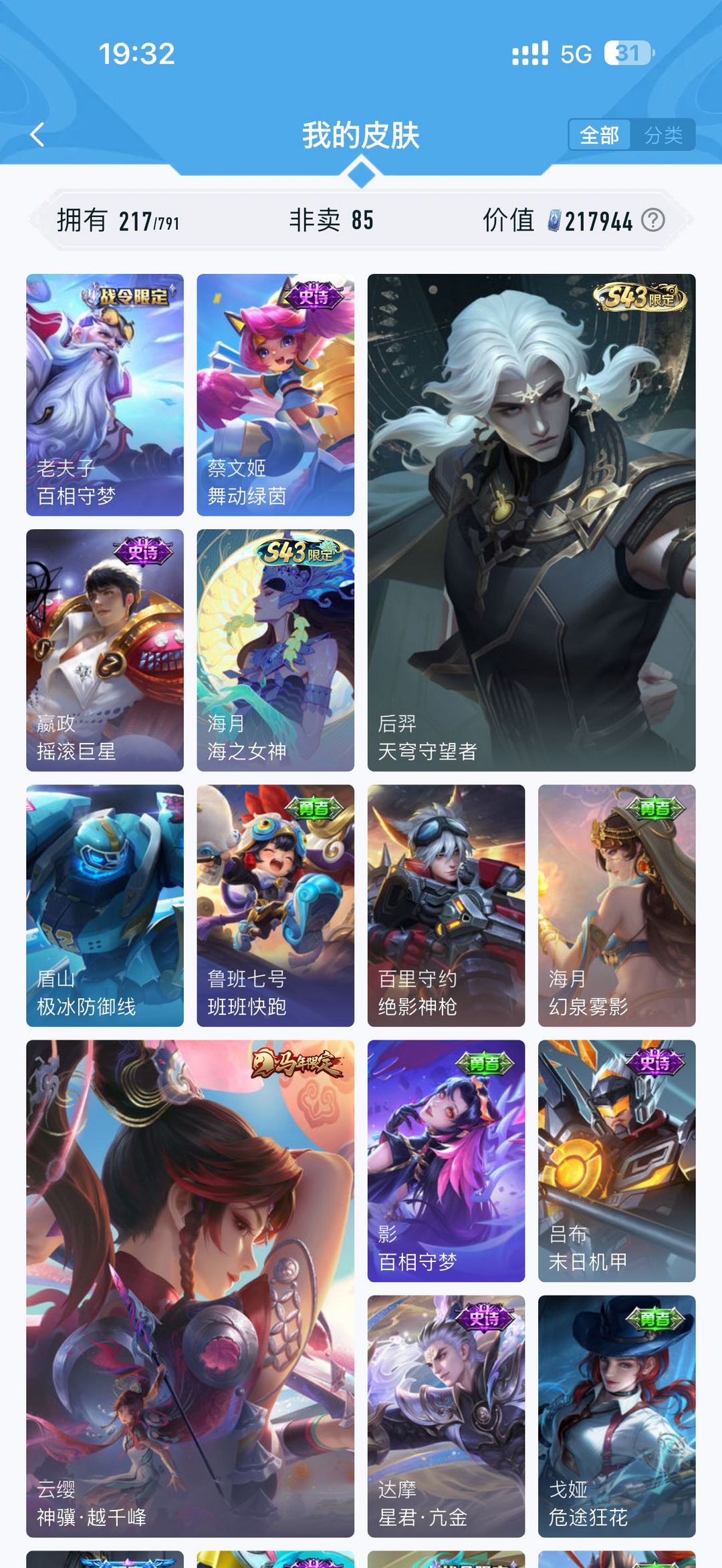 【V7 233皮】五荣耀典藏,多限定、传说皮,历史贵族9