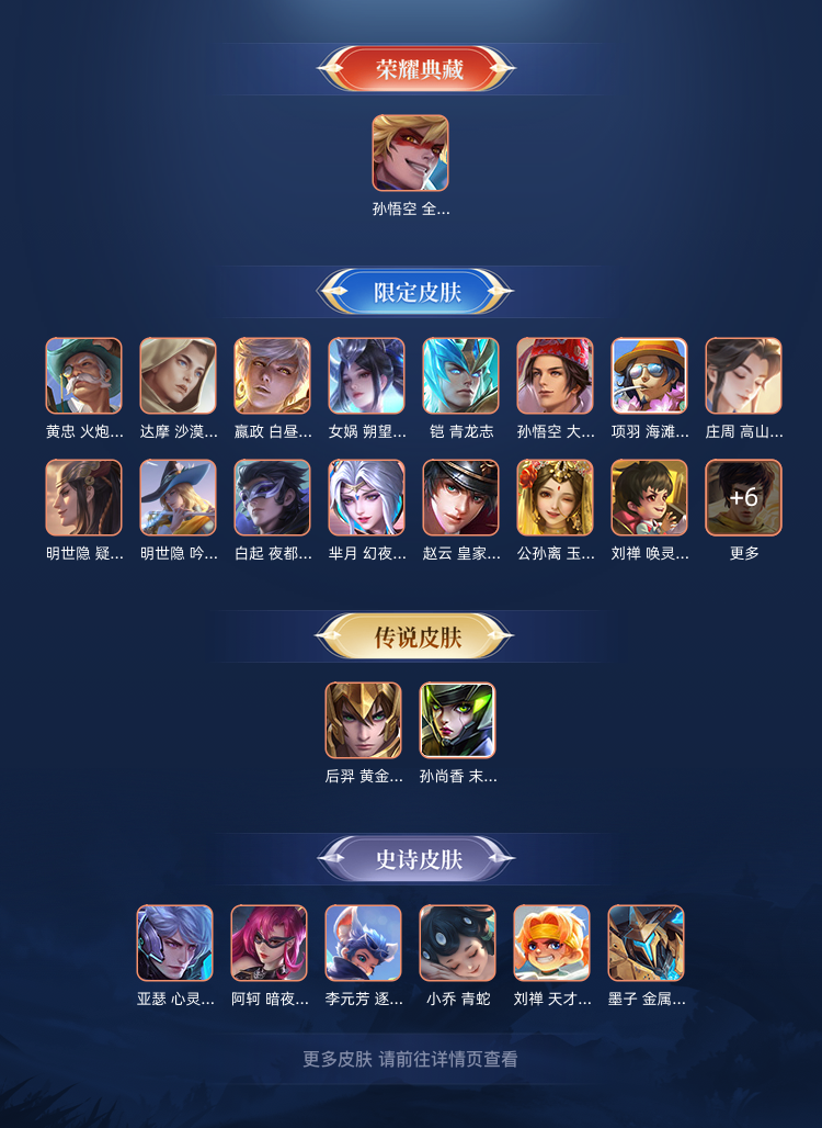 李白的千年之狐跟荣耀典藏皮肤。和孙尚香的末日机甲,镜的炽阳神光,韩信的白龙吟等等。