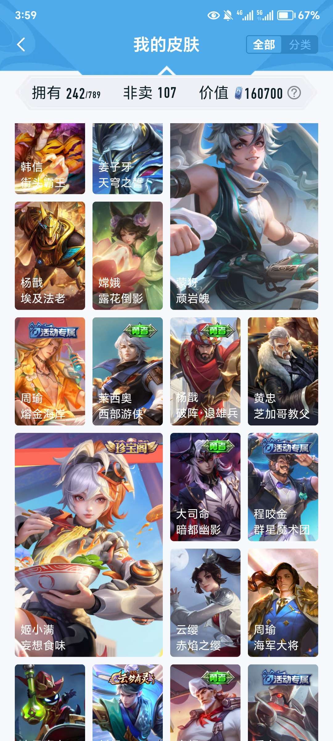 【V10 519皮】518皮,3无双,2珍品,4荣耀典藏,女号。