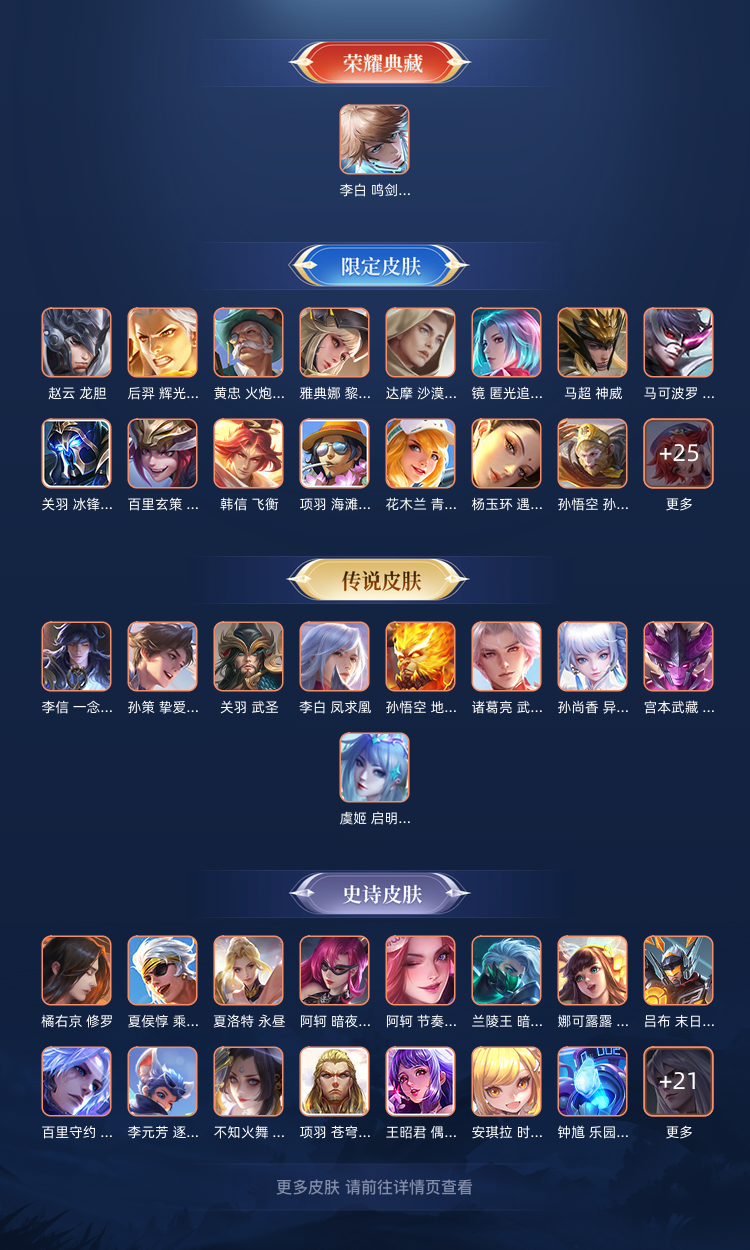韩信典藏×蛇年澜司空震×齐天大圣×怪盗基德×等28款传说,130款限定皮,105款史诗皮等