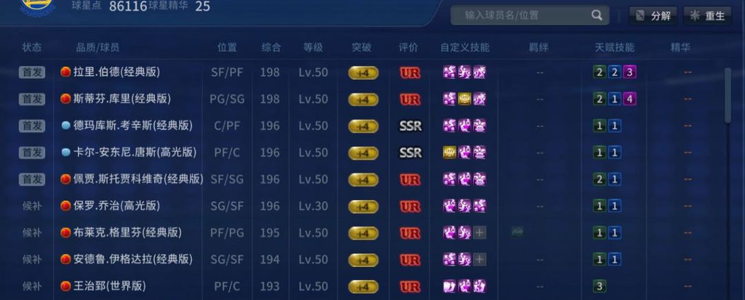 最新SSR96乔丹⭐玫瑰SSR考辛斯SSR沃克⭐⭐SSR巴特勒。SSR麦基一套王朝阵容。