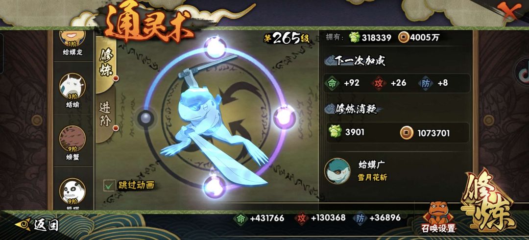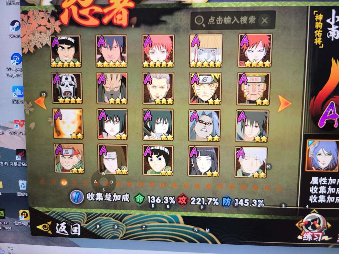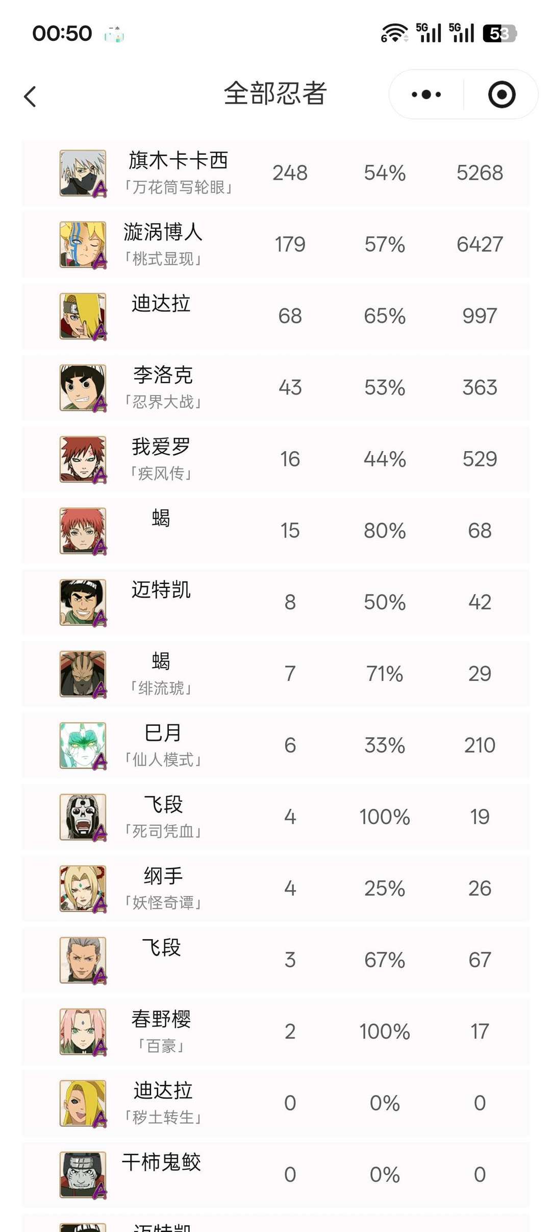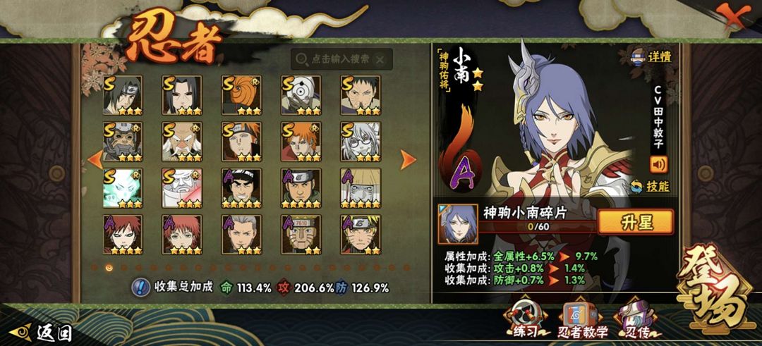 S忍者31个,A忍者52个,有熊猫,蛞蝓,万蛇,1383万战,10级霸体,无晓创生蝎