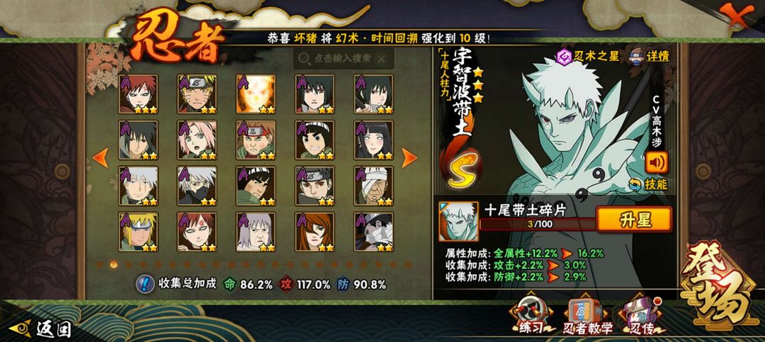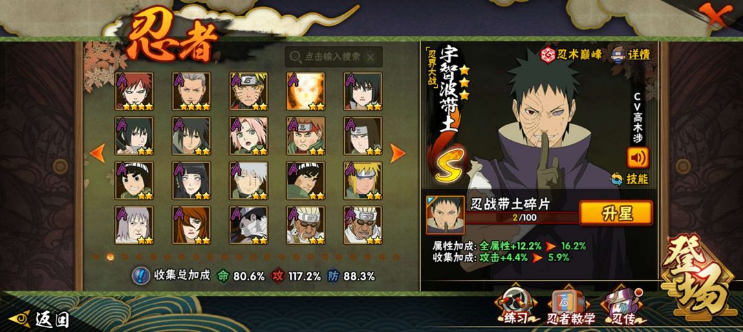22s41a1335万战力忍战带土,九喇嘛鸣人,永恒佐助,忍战艾,6尾鸣人,创立柱间,秽土鼬,等S