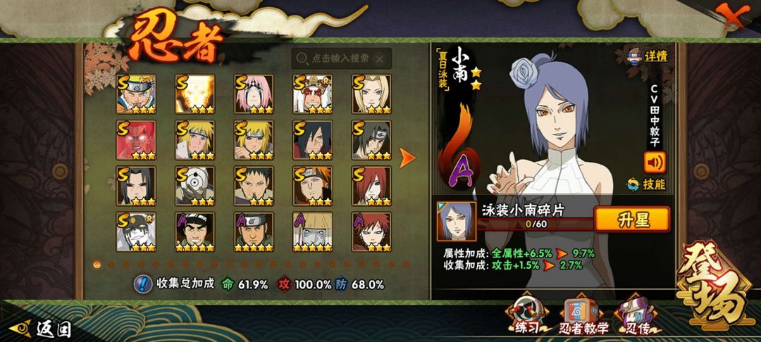 黄猿,解班,传自,忍战樱,侠影纲手(带皮肤),新春小南,10S 27A超多B忍和C忍