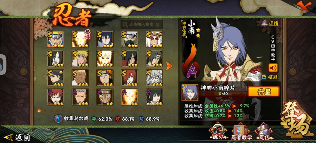 全忍者♊全奥义43S丨72A全通灵♊秽土解斑♊漂泊小南♊创立扉间♊永恒佐助丨金鸣♊2700万战力