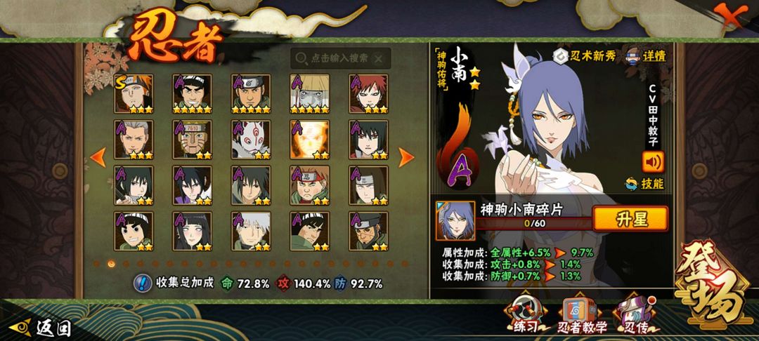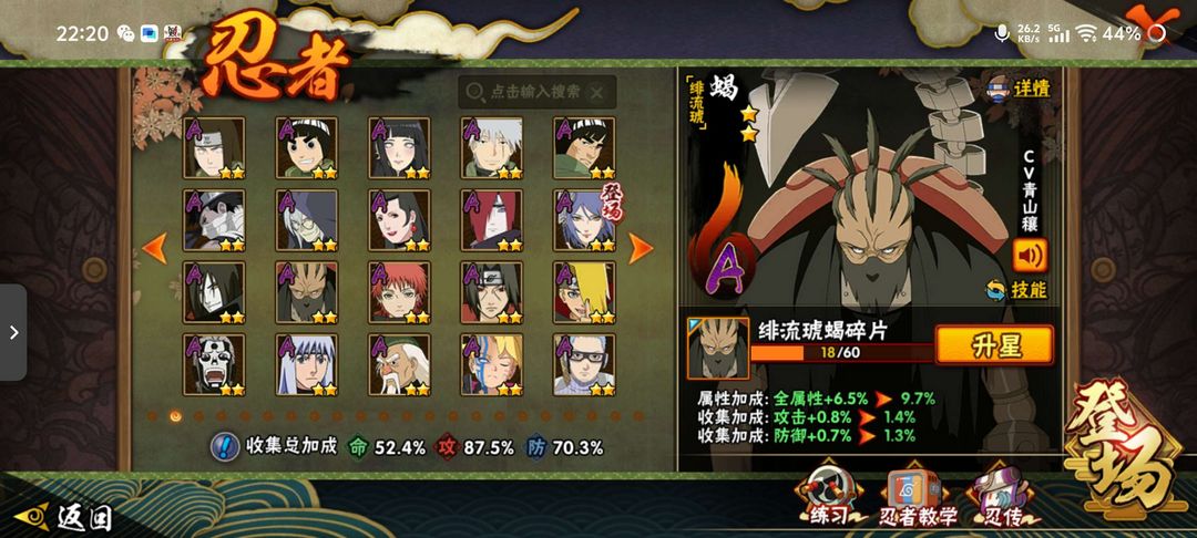 1720W+;段位:暗部1阶;本服排名:110VIP10级;S忍31个;A忍48个;通灵兽22个;