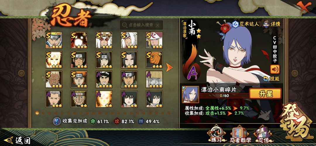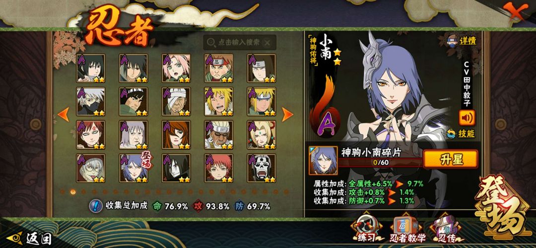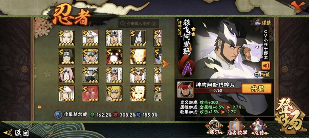 S忍者31个,A忍者52个,有熊猫,蛞蝓,万蛇,1383万战,10级霸体,无晓创生蝎