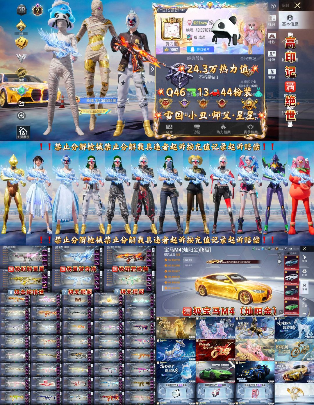 满级黄金宝马/满级星梦奇缘满级超新星M4满级熔岩AK/2级木乃伊雪国小丑都市赤蝎金鞋龙师傅星星裤