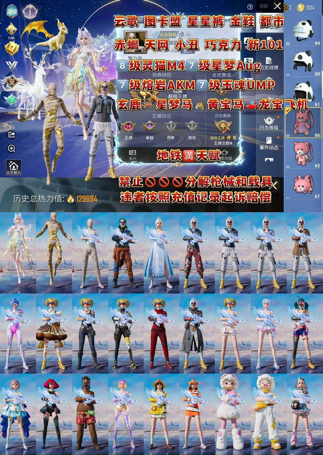 6级木乃伊雪国/小丑都市赤蝎金鞋/龙师傅外套星星裤/满级哪吒斯噶/满级超新星M4/7级无垠阁