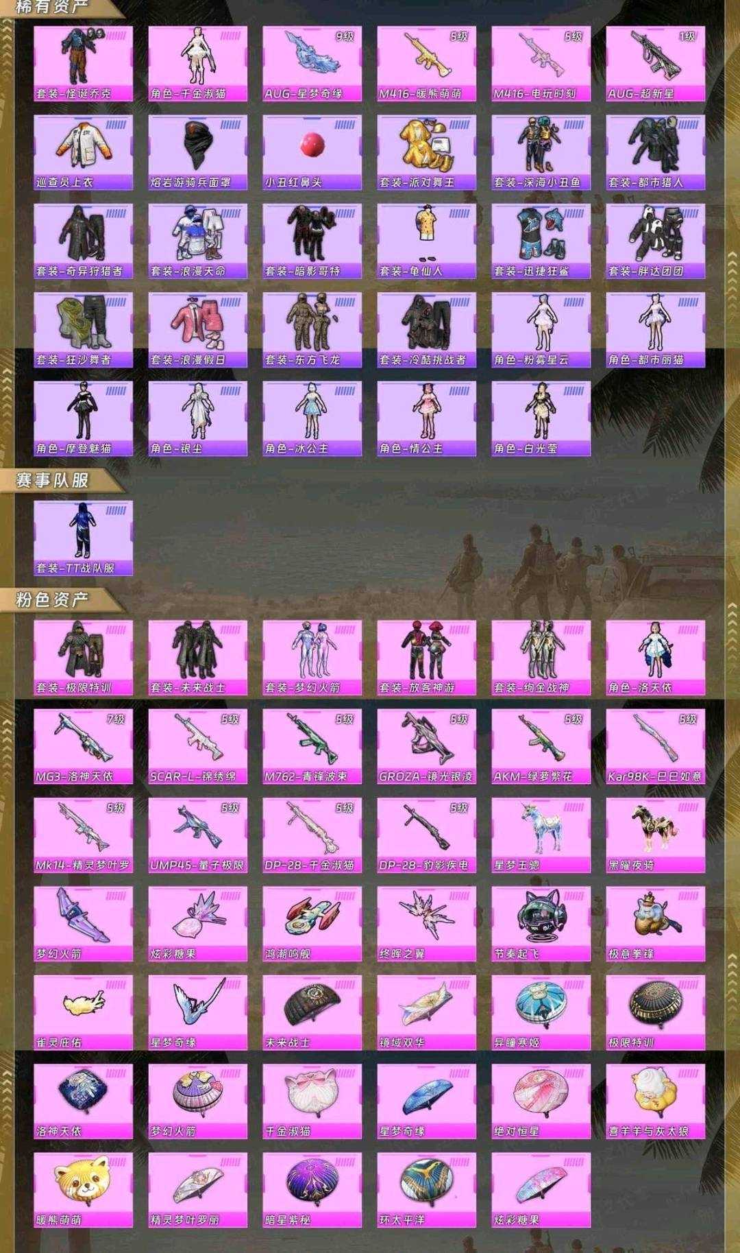 遇到设备L选择✨2红✨妮芮妲✨熬渊✨都市猎人✨觉醒红/金/紫螳螂✨奶龙墨龙M4满级SCAR满级98k