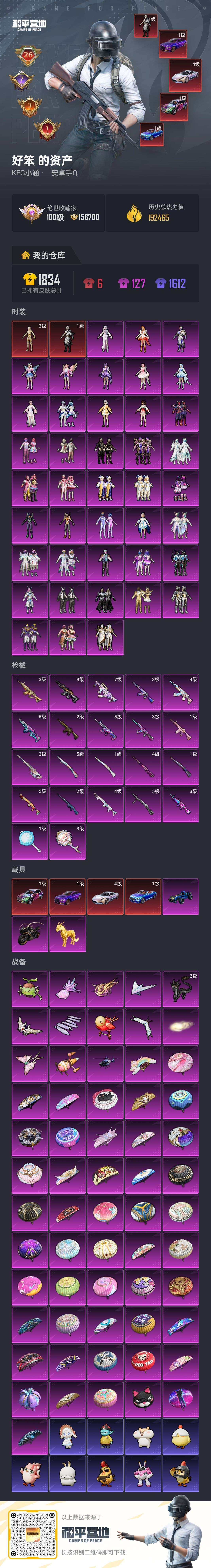 3个红装,粉皮若干,车皮17个,升级枪很多,几乎满级