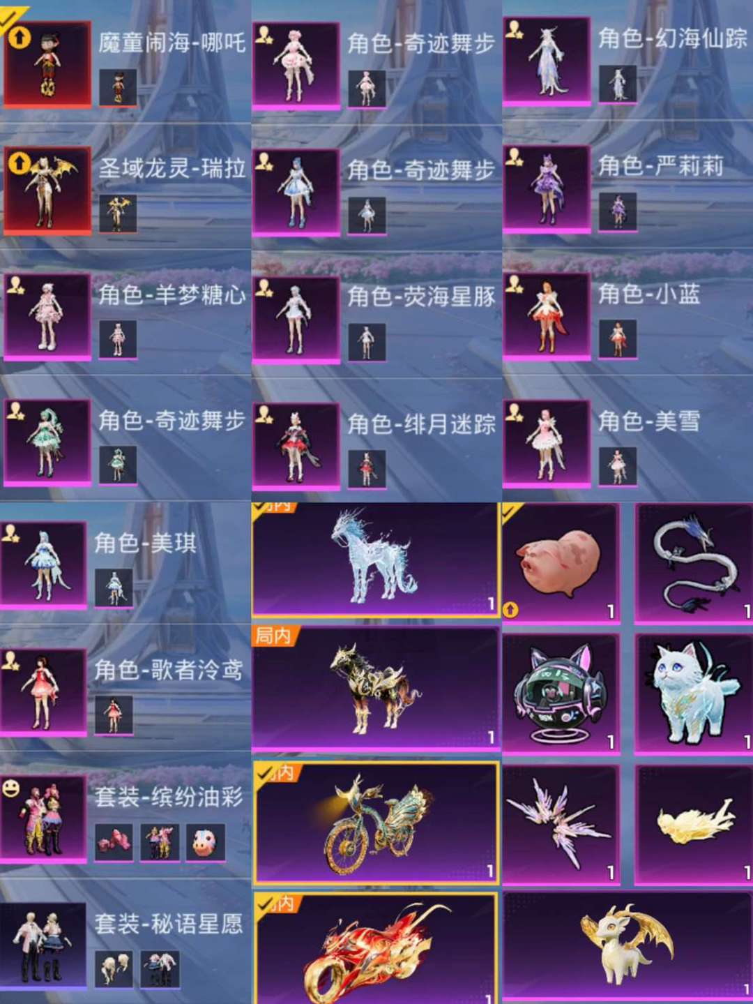 1红装(灵猫),5粉装,8粉枪,1载具,14粉色战备,47套装,85枪械,100装备,4滑翔尾翼