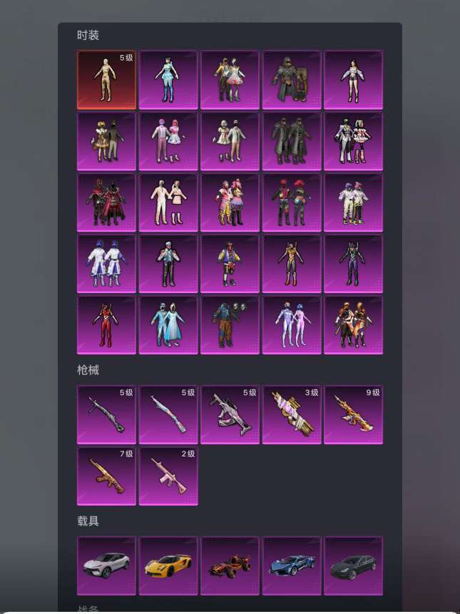 【载具:16】3粉装/4特效枪/9载具/1僚机/五爪金龙满级,炫紫旋律,时空跃影,麒麟马,帕加尼等等