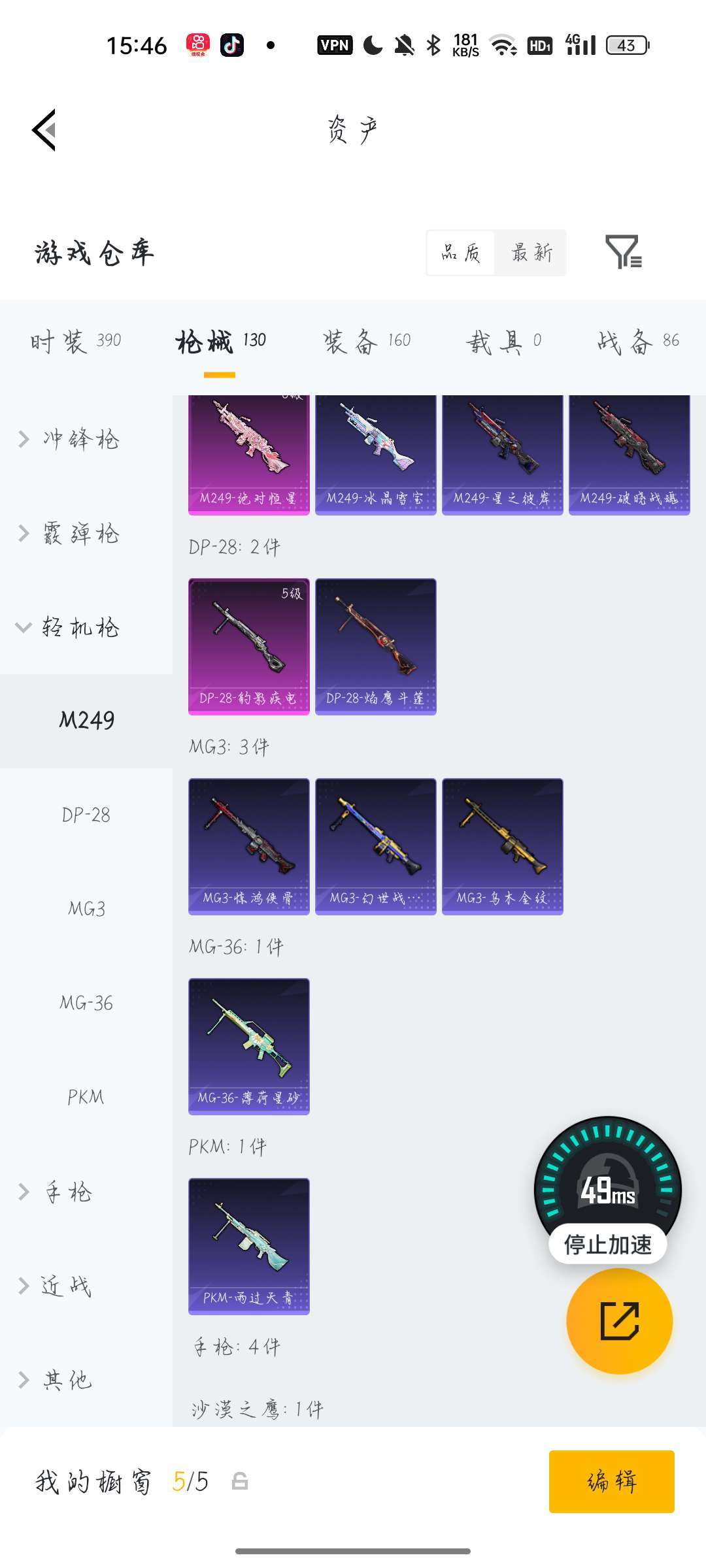 皮肤192,衣服657,装备158,无载具皮肤,平时不怎么玩