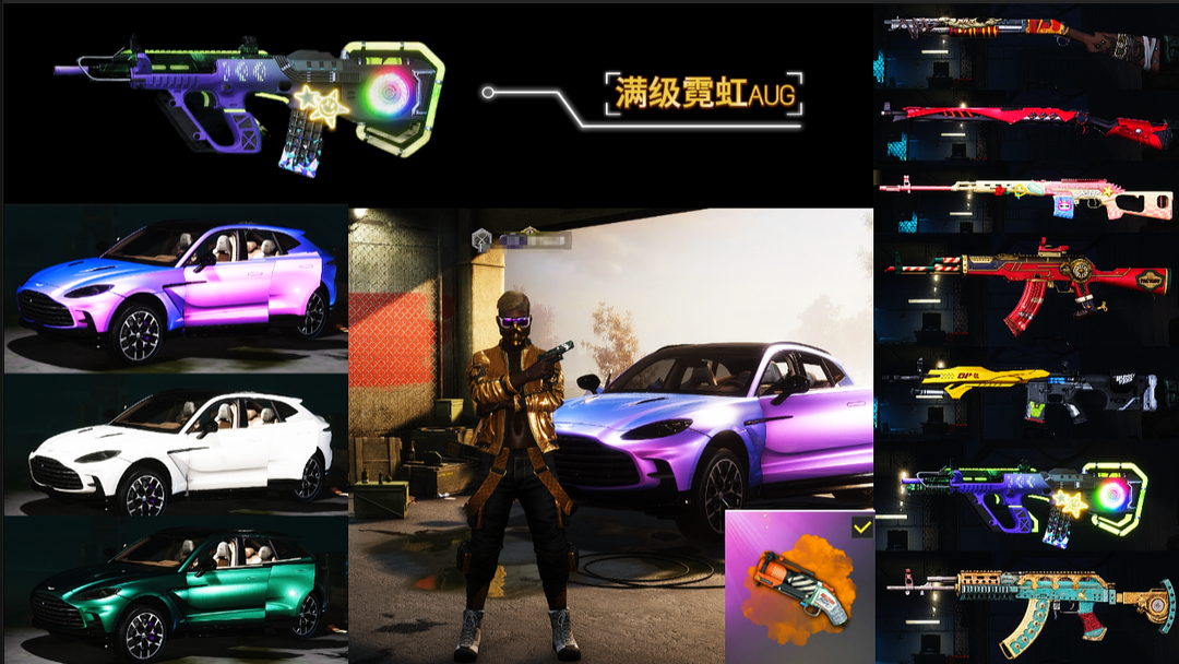 可排位-阿斯顿马丁跑车✅②级霓虹AUG✅①级青龙M762✅①级捣蛋M4分秒M4