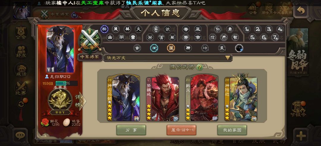 5k卡有8802豆回廊双动刘焉回廊神郭嘉回廊神荀彧动神司马郡司马师清河公主誓太史慈动神司马