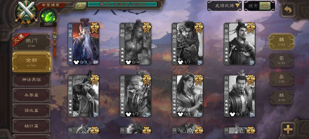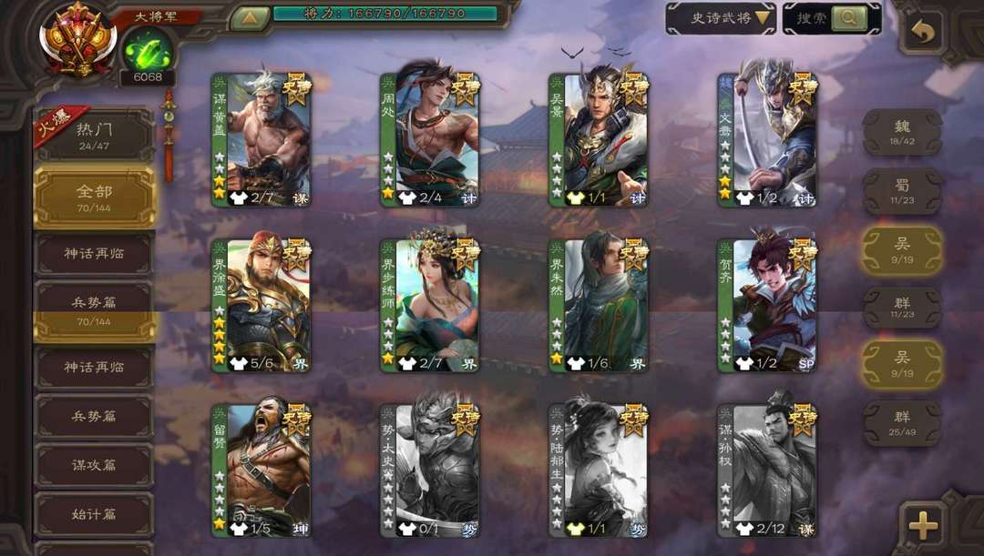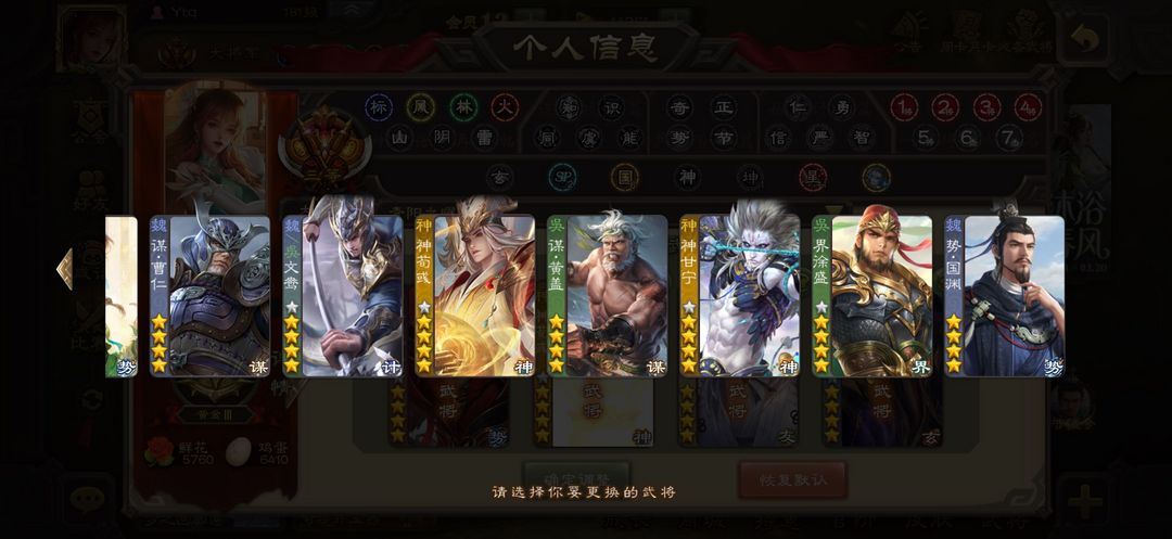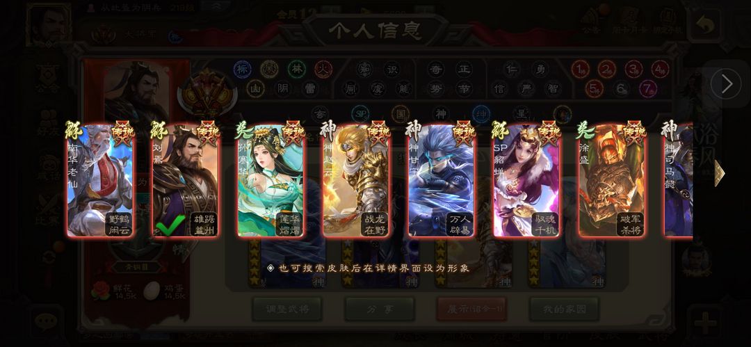 有卡,骠骑将军,谋诸葛亮,势陆郁生,星黄忠,周处,大宝等21个史诗,可排位可斗地主