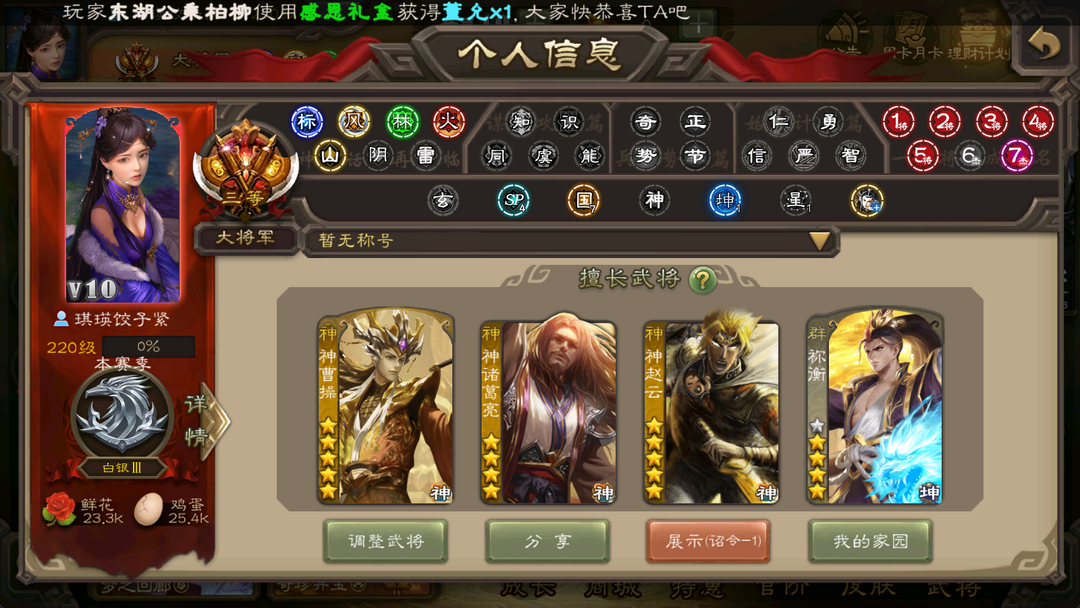 有卡65史诗大将军动态神荀彧♥老刘♥动态神郭嘉♥动态神甘宁♥神赵云♥神吕布♥杜预♥大宝♥