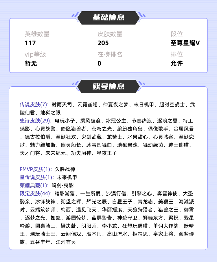 >>>>>>毁号,涉及毁坏虚拟财产罪及计算机安全罪,请文明游戏素质游戏,让我们共建美好租号平台>>>>>> 本游戏账号: ,英雄多,皮肤多。典藏皮肤1个,感受典藏皮肤带来的优质体验快感,FMVP皮肤1个,尽情享受FMVP皮肤带来的主角光环, 私人所属英雄皮肤有:李白 鸣剑·曳影貂蝉 仲夏夜之梦||孙尚香 末日机甲||虞姬 云霓雀翎||狄仁杰 超时空战士||宫本武藏 地狱之眼||诸葛亮 时雨天司||诸葛亮 武陵仙君干将莫邪 久胜战神,等等 注意事项: A.游戏过程中请不要恶意挂机或者不文明发言;B.恶意挂机、顶号等行为将被拉黑无法再次下单;C.进入游戏后中途请勿退出登陆,否则无法再次上号;D.部分账号由于异地登录可能会出现密码错误提示,通常再尝试5-6次后可上号。 |||||||||>喜欢本账号请点 ☆收藏☆ 方便下次租用,谢谢光临惠顾|||||||||