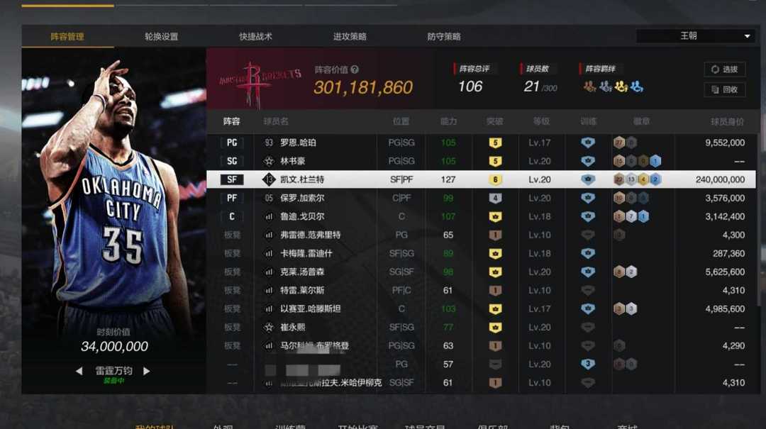 9.5亿价值阵容,满突天神詹,6邓肯,可单打可蹲底角,顶级王朝和街头号